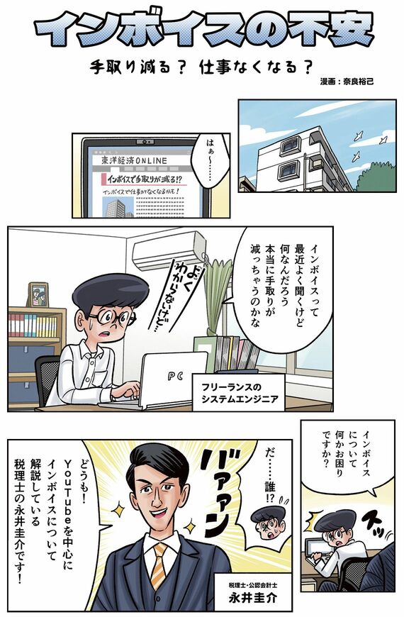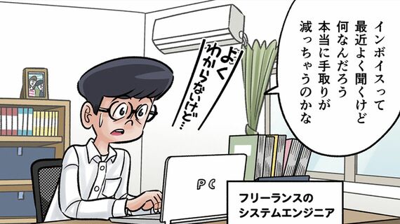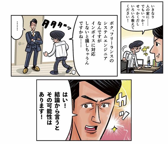 ここでは、誌面に掲載している漫画を掲載。フリーランスのシステムエンジニアや、個人タクシーの運転手、イラストレーターなどの中で、年間の課税売上高が1000万円以下の「免税事業者」に該当する場合、どんな影響があるのか? それを説明していこう。