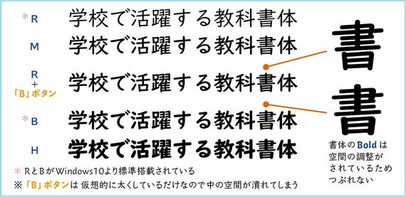 「ロービジョンのお子さんを教えている先生に、『UDデジタル教科書体だと漢字が潰れて見えるらしい』と言われたことがあります。しかし、よくよく聞くと、その先生はレギュラー(R)をWordの『Bボタン』で仮想的に太くしていました。この方法だと漢字が潰れて見えてしまうことがあるので、あらかじめ文字の空間が調整されたボールド(B)を書体名で指定していただければと思います。またロービジョンのお子さんは、教科書の本文はミディアム(M)がお勧めです。こうした使い方については、まだ浸透しているとはいえません」