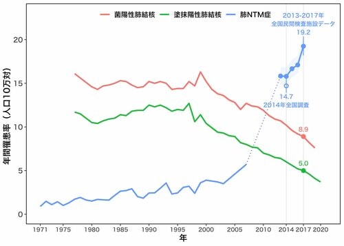 2000年以降、増加が顕著になっていると思われたが、データに乏しく、2014年に組織された現・国立研究開発法人日本医療研究開発機構(AMED)研究班の疫学調査によって、初めて罹患率が結核を超えたことが明らかになった。それが上に示したデータだ。