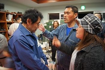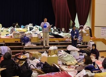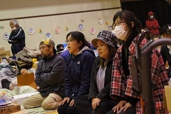 渡波小では15日午後6時30分開始の住民による「班会議」の場で、市の職員が「(約600人の避難民のうち)約250人を残して、稲井中学校または桃生地区の体育施設に移動してほしい」と通告。翌16日夜にかけて、各教室や体育館に避難している住民への説明のために小学校内を回った。が、これに住民が猛反発。16日夜9時近くになって開かれた体育館での説明会(写真)では、抗議する住民が相次ぎ、騒然とした雰囲気に包まれた。