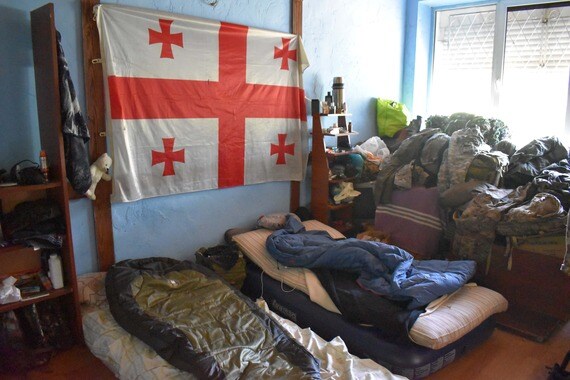 屋外の写真撮影は断られたが、建物内の寝室などは撮影することができた。ジョージアの国旗が掲げられ、寝袋などが雑然と散らばっていた。
