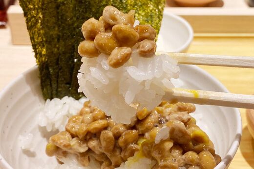 ごはんに納豆を乗せて大口を開けてかき込むと、大豆の風味とまろやかな粘りが絶妙に絡んで口の中に広がります。さらに味付けのりで巻いてパクリ。パリッとした食感と磯の香りがプラスされ、良きアクセントに。