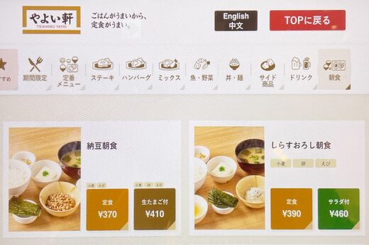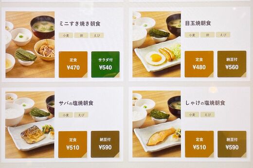 「やよい軒」のモーニングメニューは全6種類です。主力メニューの価格帯が700円台から1000円前後なのに比べて、300円台後半から500円台前半とお手頃価格になっています。