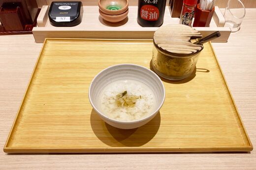 その上からだしを注いでお漬物をちょこんと乗せれば、だし茶漬けの完成です。こんぶの風味ゆたかな深みのあるだしに、白菜のお漬物の旨味と塩気が加わります。サラサラとかき込めば、五臓六腑に滋味が染み渡ります。