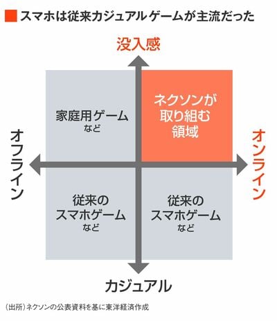 ゲームは大きく4つの象限に分けることができる。その中でネクソンは、深くて没入感のあるオンラインゲームに特化して開発・運用してきた。他の(象限の)モデルとは違うビジネスを展開しており、重視するKPI、収益の創出などもまったく異なる。
