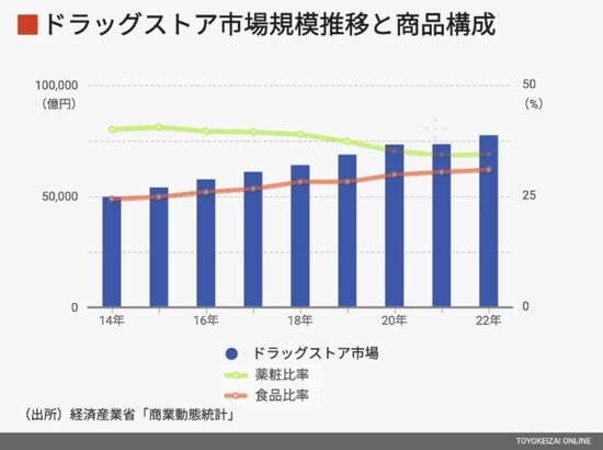 こうした話を聞けば、だったら他社も食品の比率を下げて、医薬品や化粧品を売ればいいと思うかもしれない。しかし、業界のトレンドとしては、その逆の方向に進んでいる。次の図は経済産業省の商業動態統計によるドラッグストアの市場規模と売上構成に関するデータである。順調に拡大を続ける市場規模、売り上げに占める医薬品や化粧品の比率が低下し、食品の比率が上昇していることがわかるだろう。