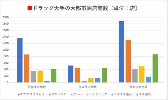 ドラッグストア大手の首都圏、京阪神における店舗数を見ると、マツキヨココカラは首都圏において圧倒的、京阪神でもトップとなる店舗網を築いていることは一目瞭然だ。