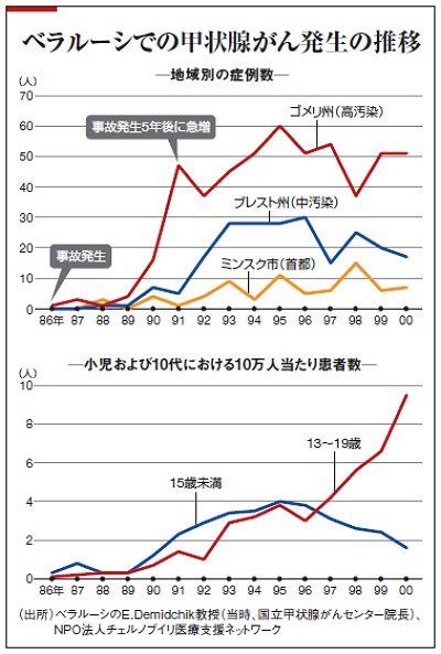 私は放射線の専門家ではないが、ベラルーシでの経験から今回の暫定基準値をどう思うか聞きたいと言われ、出席した。机の上で考える研究者というのは、どうしても現実味がないから甘い。農業生産者の立場を考えて、基準を「緩やかに」という人も委員にいて、彼らの考えもわかる。だが、私は「子どもや妊産婦の命を守るためにも、基準は厳しいほうに置いたほうがいい」と言った。チェルノブイリでは、小児の甲状腺がん患者が急増したのは事故から5年後だ(下グラフ)。