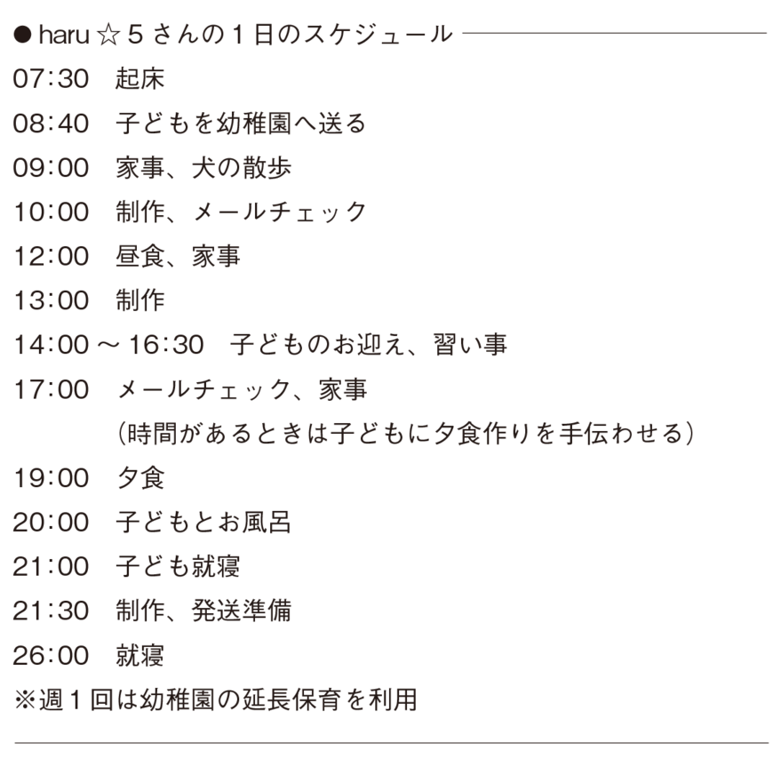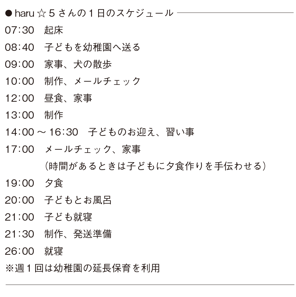 育児の合間の趣味から始まり、今では月10万円ほどの売り上げも出るようになったharu☆5さん。「マーケットプレイスで作品を販売していなかったら、今頃きっと働きに出ていたと思う」と話す。「子育てだけをしていたときは、なんとなく物足りなさを感じていた」からだ。
