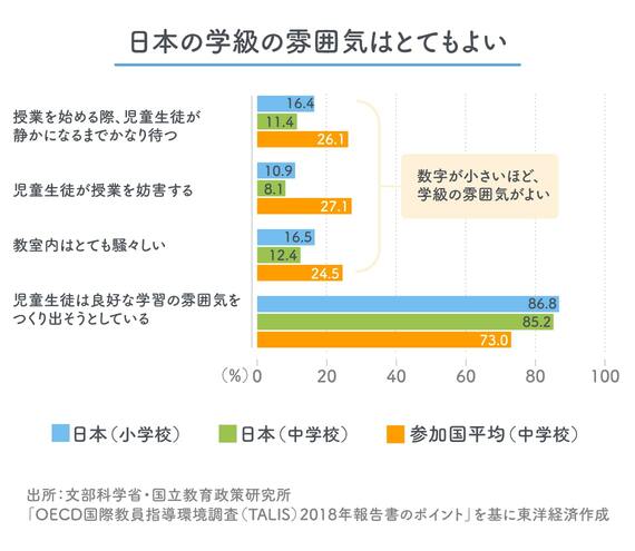 「TALIS」は小中学校の教員および校長への質問紙調査を通して学校の学習環境や教員の勤務環境に焦点を当てた国際調査ですが、18年の調査では、「児童生徒が授業を妨害する」「教室内はとても騒々しい」などの数値が調査参加国の平均値と比べて低く、学級において規律や良好な学習の雰囲気が整っているといえます。
