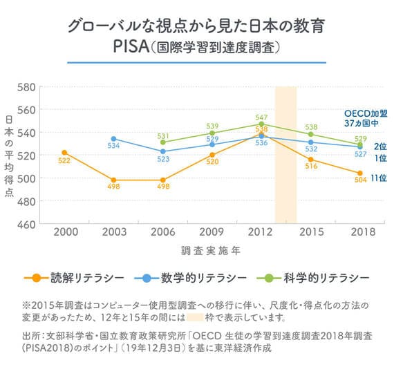まず第一に言えるのは、生徒の学力の高さです。日本の生徒のPISAの平均得点の推移を見ると、読解リテラシーはその年によって多少の変動はありますが、数学的リテラシー、科学的リテラシーはずっと世界トップクラスで、2018年調査では、数学的リテラシーの平均得点は527点でOECD加盟37カ国中1位(OECD平均489点)、科学的リテラシーの平均得点は529点で2位(OECD平均489点)、読解リテラシーの平均得点は504点(OECD平均487点)で11位でした。PISAの問題は、いわゆる“知識を問う”内容ではなく、思考プロセスの習得や概念の理解を重視し実生活で使える応用力を問う内容です。平均的にこれだけ高い学力を持っている日本の子どもたちは、「基礎的な生きる力を持っている」と解釈しています。