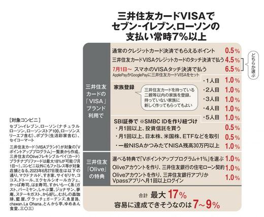 このプログラムでは、家族登録やSBI証券での資産運用、三井住友「Oliveアカウント」作成のうえアプリログイン等の条件を達成すると、前述の7%が最大17%まで跳ね上がる。