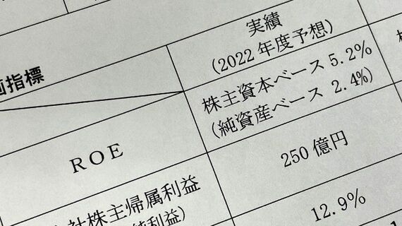 3月に京都銀行が公表した中期経営計画には、2023年3月期決算におけるROEの実績数値が“2つ”記されている。1つは2.4%、もう1つは5.2%。乖離の原因は前者が「純資産ベース」、後者が「株主資本ベース」で算出されていることだ。