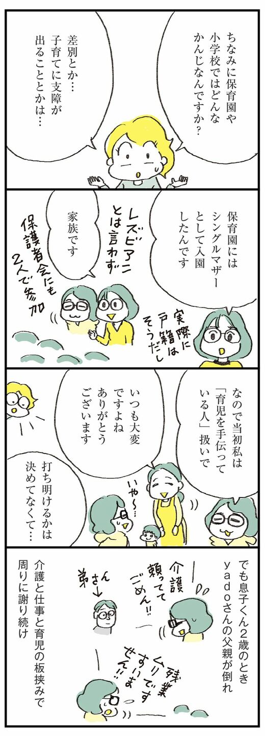 ライフ #ほしいのは「つかれない家族」 前の記事 次の記事 ママが2人!レズビアンカップルの子育ての現実 病気休職のときも、日々の育児でも支え合う 4分で読める 公開日時:2023/07/09 10:00 ハラユキ イラストレーター、コミックエッセイスト フォロー 1/11 PAGES 2/11 PAGES 3/11 PAGES 4/11 PAGES 保育園にはシングルマザーとして入園 次ページが続きます:【yadoさんはうつ病に…】 5/11 PAGES 6/11 PAGES 7/11 PAGES 8/11 PAGES 9/11 PAGES 10/11 PAGES 11/11 PAGES