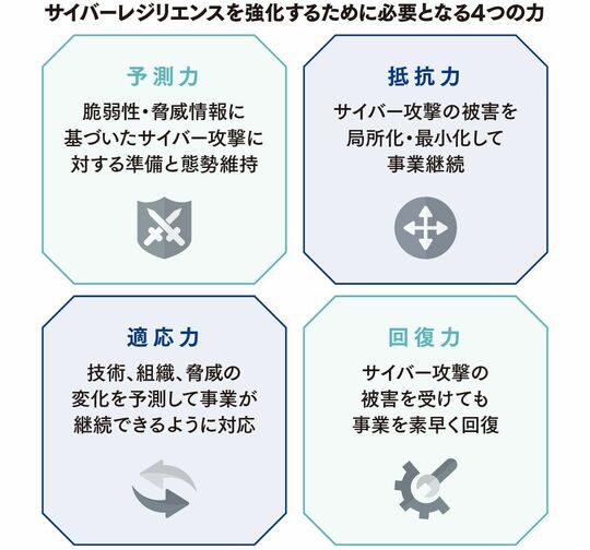 このコンセプトは一般に「サイバーレジリエンス」と呼ばれる。企業がサイバーレジリエンスを強化するために備えるべき力として、NIST(米国立標準技術研究所)が定義するのは「予測力」「抵抗力」「回復力」「適応力」だ。