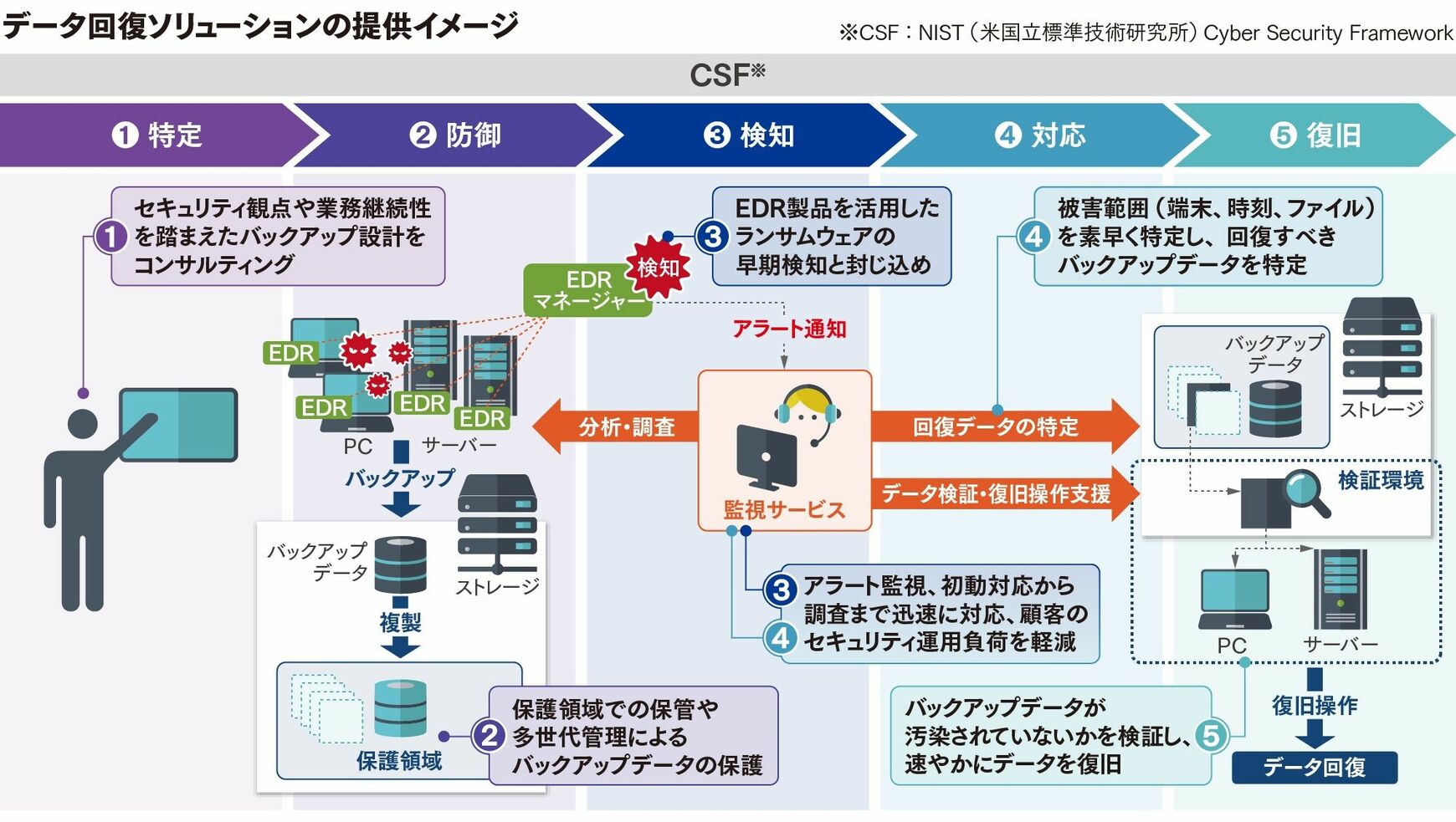 そうした背景の下、日立ソリューションズは「データ回復ソリューション」として、事業継続性を踏まえたバックアップの設計から構築、業務端末の日常的な監視・運用や、インシデント発生時の初動対応から復旧までをワンストップで提供。万一ランサムウェアに感染した場合の迅速な事業の復旧を支援している。