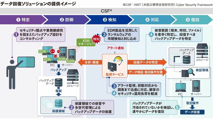 また、最近のランサムウェア攻撃ではバックアップシステムを狙うものも増えている。前出の警察庁の調査では、バックアップから被害直前の水準までデータを復元できたのは19%にとどまった。迅速な回復には、バックアップの感染防御、およびきちんとデータを復旧できる仕組みをつくることも大切になる。