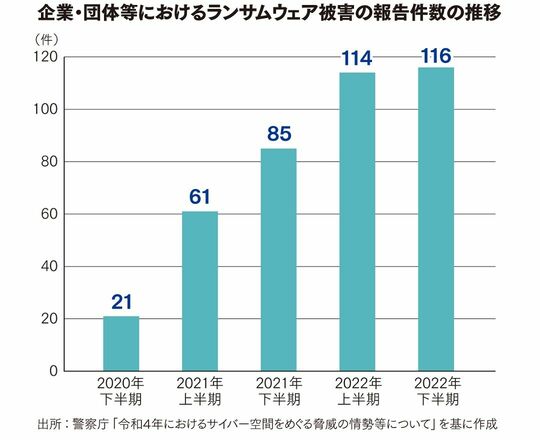 暗号化したデータと引き換えに身代金を要求するサイバー攻撃であるランサムウェア。その被害は近年増加しており、警察庁の調査※によると、2022年に警察庁へ報告された被害件数は前年比57.5%増の230件に上った。