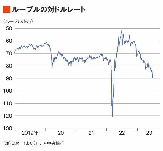 ウクライナ侵攻直前の昨年2月23日時点のルーブルの対ドルレートは、1ドル=80.4ルーブルであった。ウクライナ侵攻直後には1ドル=120ルーブルを超えるまで大暴落し、その後は50ルーブル近くまで「V字回復」したルーブル相場だが、結局はウクライナ侵攻前よりも安値圏にまで下落してしまった。