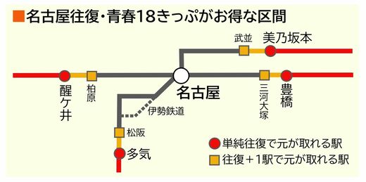 名古屋駅まで単純往復+1駅利用なら、さらに名古屋寄りの駅からでもおトクだ。例えば紀勢本線松阪駅からはJR線分の往復運賃が2340円(別途伊勢鉄道線+1040円)なので、名古屋駅付近で1駅でも追加利用すれば18きっぷ2410円のほうが割安になる。
