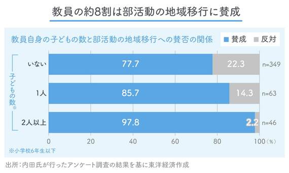 小社の保護者アンケートは、まだ実態が見えない中で、地域移行賛成は4割にとどまったものの、教員の部活指導の負担を知っている保護者は7割に上った。内田氏が実施した教員を対象にした調査では、教員の約8割は地域移行に賛成で、とくに小学生以下の子どもが2人以上いる場合には98%近くにまで跳ね上がるという結果になっている。
