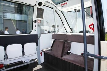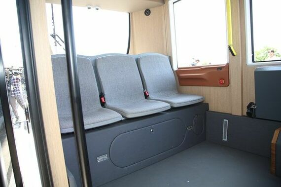 ミカは、バッテリーとモーターで駆動するEVタイプのマイクロバスだ。すでに日本導入されているアルマと同様、自動運転を前提としているため、ステアリングばかりか運転席すらない。