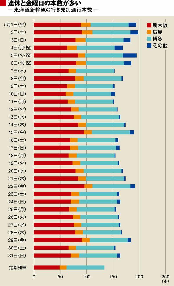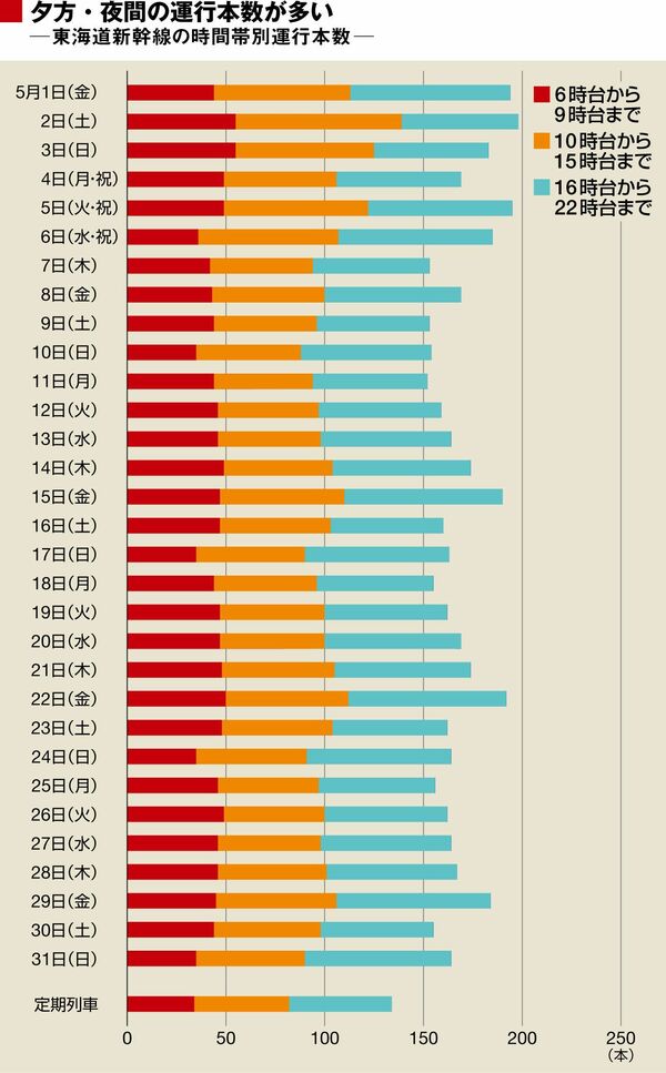 「のぞみ295号」のような列車は数多く、しかも運転日は列車ごとに違う。この結果、ダイヤは日ごとにまちまちで、「時刻表を見ないと利用できない」どころか「時刻表を見てもよくわからない」状態を呈している東海道新幹線のダイヤが日ごとにどの程度異なっているのかについて、2015年5月を例に調べてみた。