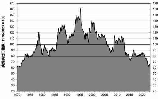 実際、「実質実効円」は過去半世紀で最も円安になっている。この指標は、日本とすべての貿易相手国との間の価格動向の差を考慮したものである。結果として、実質実効円は、海外市場における日本製品の価格が競合他社の価格と比較してどうなのかを示している(下図参照)。