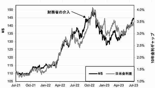 そのためには、投資家は円を売らなければならず、需要と供給の法則によって円の価値が下がる。実際、2021年7月以降、金利差の日々の上下とドル円レートの日々の動きの間には、97%という驚くほど高い相関関係がある。現在、金利差は約3.5%であり、1ドル=145円はその金利差に一致している。昨年9月から10月にかけての財務省の介入は、この連動性に一石を投じるものではなかった(下図参照)。