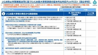 文科省はいじめ重大事態への対応マニュアルをまとめたチェックリストをすべての国立学校、公立学校、私立・公立大学附属・株立学校向けにそれぞれ作成。