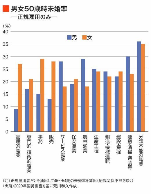 つまり、男性の場合は正規雇用のほうが結婚しやすいが、女性の場合は正規雇用であるほうが未婚は多いということになります。