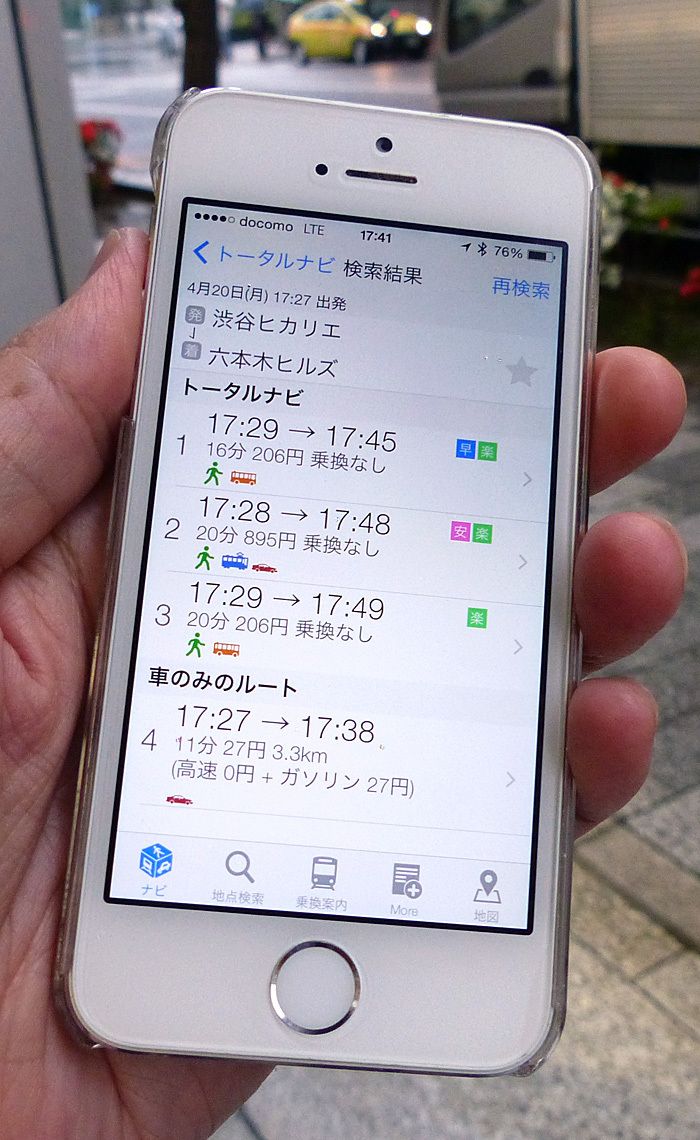 たとえば、現在地を入力し、次に取引先の会社名やその会社の住所を入力すると、GPS機能を使い、徒歩の所要時間とともに鉄道やバスを使った最適な路線が同時に表示される。自動車も含めたルートや所要時間も表示されるので、電車かタクシーのどちらを選ぶかという選択も可能となる。