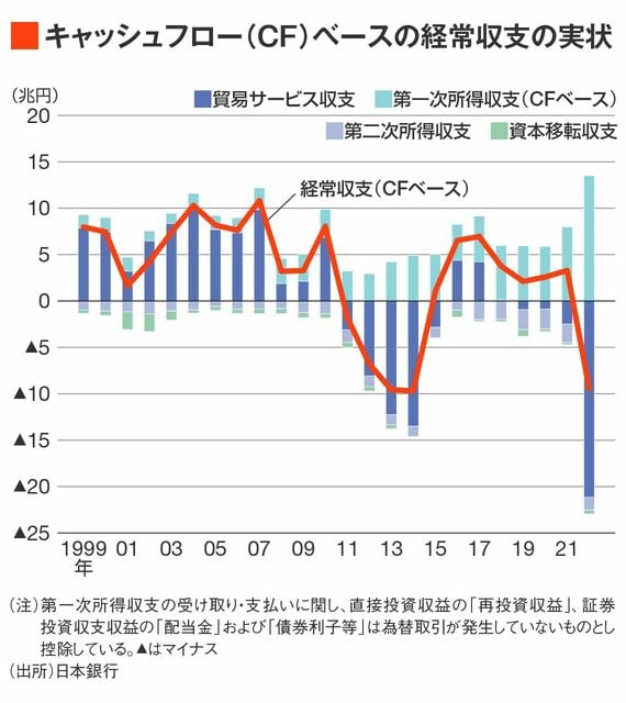 ちなみにキャッシュフローベースの経常収支が2022年と匹敵するほど赤字(9兆円以上)だったのは2013年と2014年だが、いずれの年も円は対ドルで10%以上下落している。