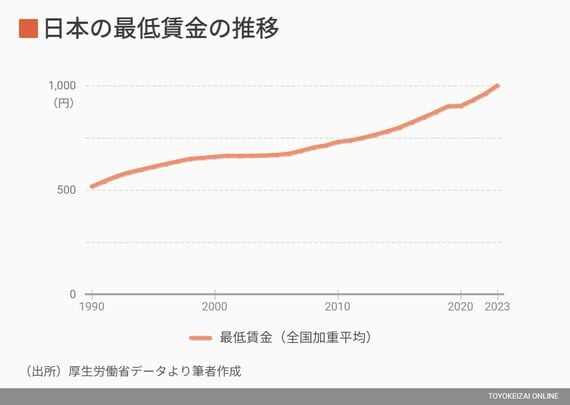 2023年に1000円になると、安倍政権以降、最低賃金は金額にして251円、1.34倍に上昇することになります。1990年と比べると、最低賃金は484円も上がって、1.9倍になります。