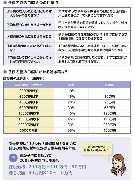 子供が子供名義の口座の存在を知らない場合、将来同じ銀行で口座を開けなかったり、相続税がかかったりするケースが。子供名義の口座の存在は、早くから子供に知らせましょう。