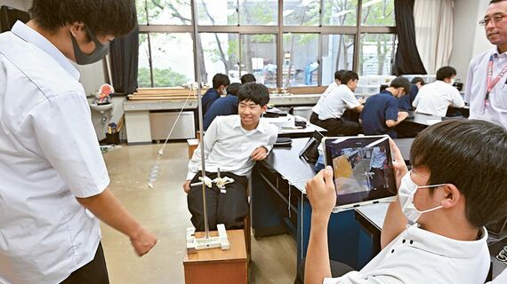 高校2年生の「市川サイエンス」の授業で2重振り子について調べる生徒たち。3、4人の専門教員が様子を見守っていた(撮影:風間仁一郎)