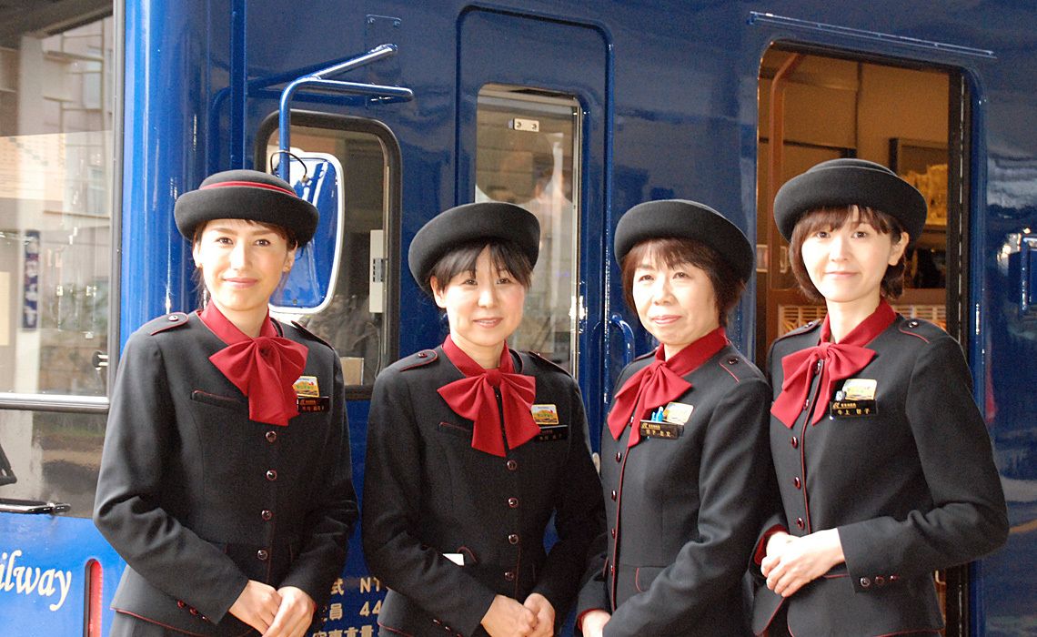 優れた観光列車は、車両デザインだけでなく、客室乗務員のおもてなしも重要だ。のと鉄道は、今回の観光列車導入に際してアテンダントを4人採用した。