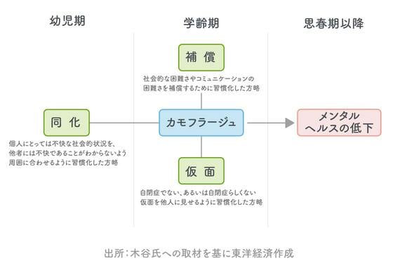 海外では2010年以降、発達障害に限らず、例えばLGBTQや民族性など、文化論的な研究も進められています。ただ近年は、思春期以降にメンタルヘルスが低下しやすいという特性から、カモフラージュは発達障害のある人に顕著に見られるといわれています。