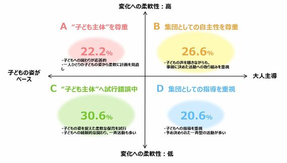 Aは「”子ども主体”」を尊重(22.2%)、Bは「集団としての自主性を尊重」(26.6%)、Cは「”子ども主体”へ試行錯誤中」(30.6%)、Dは「集団としての指導を重視」(20.6%)。Aは子どもへの関わりが応答的で、一人ひとりの子どもの姿から保育の計画を柔軟に見直す形で実現できているという。CがAと異なるのは、園内の一体感や保育者同士の子どもの姿の語り合いの有無、記録の充実度などだという。