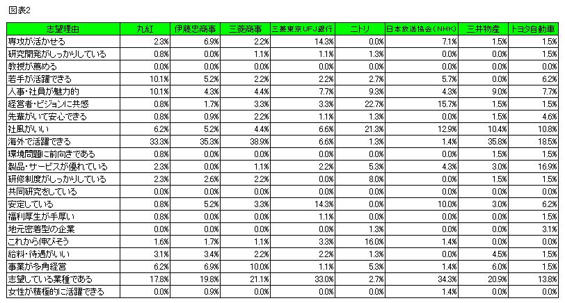 4位の三菱東京UFJ銀行と6位のNHKは「志望している業種である」が30%台と高い。「製品・サービスが優れている」という項目はいずれの企業でも低いが、メーカーであるトヨタ自動車は16.9%と評価されている。同社はリコール問題などで揺れたが、学生はトヨタ品質を支持している。トヨタ自動車の志望理由で最も高かったのは、「海外で活躍できる」の18.5%。