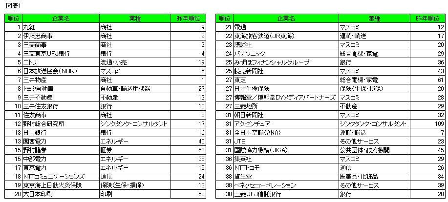 ほかはメガバンク、電力会社、シンクタンク、大手通信企業、そしてトヨタ自動車と定番企業が上位を占めた。