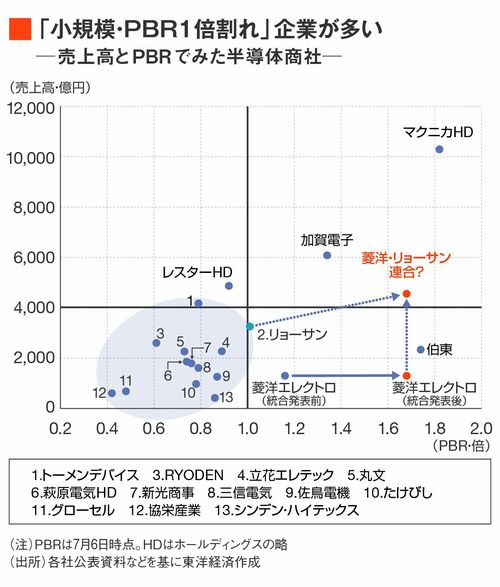 業界内では、「もともと収益性の低いビジネスモデルなので、PBRを大幅に改善するのは難しい」という見方が根強い。だが、売上高規模の大きい商社のPBRは高い傾向にある。菱洋エレクトロも統合を発表してからPBRが改善している。