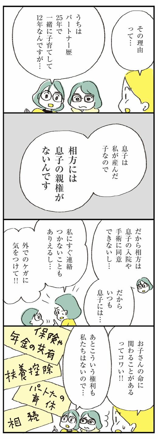 ライフ #ほしいのは「つかれない家族」 前の記事 次の記事 20年同居しても「他人」…結婚できない人々の現実 入院に同意できず、相続も家族のようにできない 5分で読める 公開日時:2023/07/23 10:00 ハラユキ イラストレーター、コミックエッセイスト フォロー 1/12 PAGES 2/12 PAGES 3/12 PAGES 4/12 PAGES 5/12 PAGES 親権、病院での同意、相続…さまざまな権利がない 次ページが続きます 6/12 PAGES 7/12 PAGES 8/12 PAGES 9/12 PAGES 10/12 PAGES 11/12 PAGES 12/12 PAGES