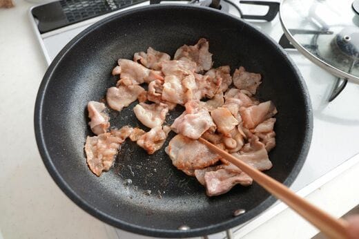 サラダ油をひいたフライパンに豚肉を並べ、中火にかけます。
