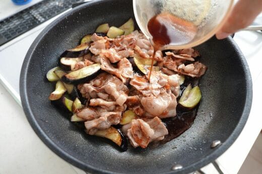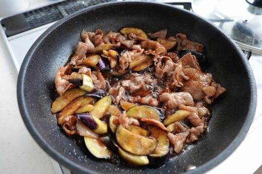 薄切り肉は、加熱しすぎを防ぐため、イメージとしては片面焼きです。焦げ目がついたら裏返し、さきほどバットに移しておいたナスを戻します。