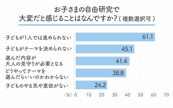 このほか「自由研究は強制ではないので、子どもがやりたがらない」「やる気になってもらうことが一番難しいと感じます」との声があり、子どもの好奇心を引き出すために親も関わり方に苦労している様子がうかがえた。