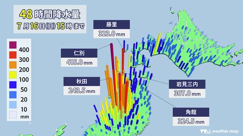秋田県内の仁別では、48時間降水量が400mmを超えました(最大値は16日14時50分までの48時間降水量415.5mm)。秋田県内の藤里、岩見三内、角館でも300mm超え、秋田でも200mmを超えて、観測史上1位を更新しました。