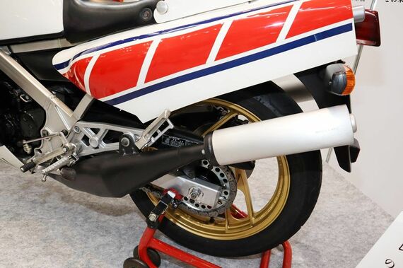排気システムでは、車体左右に2本、シートカウル下に2本という、計4本のチャンバーを装備する。チャンバーとは、4ストローク車でいうエキゾーストパイプのようなもの。中央部に膨らんだ形状の膨張室を持たせることで、排気効率などを向上させる2ストローク車特有の排気システムだ。RZV500Rでは、かなり極太のチャンバーを採用し、リヤビューにワークスマシンさながらの迫力あるフォルムを生み出している。