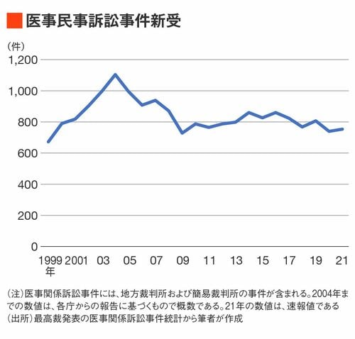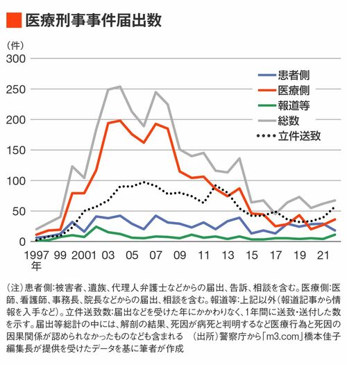 元検察官の研究(飯田英男『刑事医療過誤Ⅱ[増補版]』、判例タイムズ社)によれば、戦後から1999年1月までの裁判件数は137件(そのうち公判請求事件は73件)、1999年1月から2004年4月までは79件(公判請求事件は20件)で、下のグラフのように1999年から、医療刑事事件届出数が著しく増加しました。