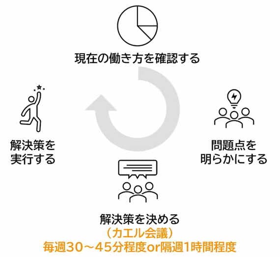 現在の働き方を確認して問題点を共有し、解決策を決めて実行するサイクルを高速で回すことだ。名付けて「カエル会議」。数名の教員をメンバーとし、毎週30~45分程度、または隔週1時間程度の会議を開き、短期間で解決策と実行者を決め、フィードバックをかけていくというもの。「カエル会議を開く間隔を1〜2週間に1回の頻度にすることで取り組みが継続的・効果的になります。職員会議の時間の一部に組み込み、業務時間が増えないようにするのがポイントです」。